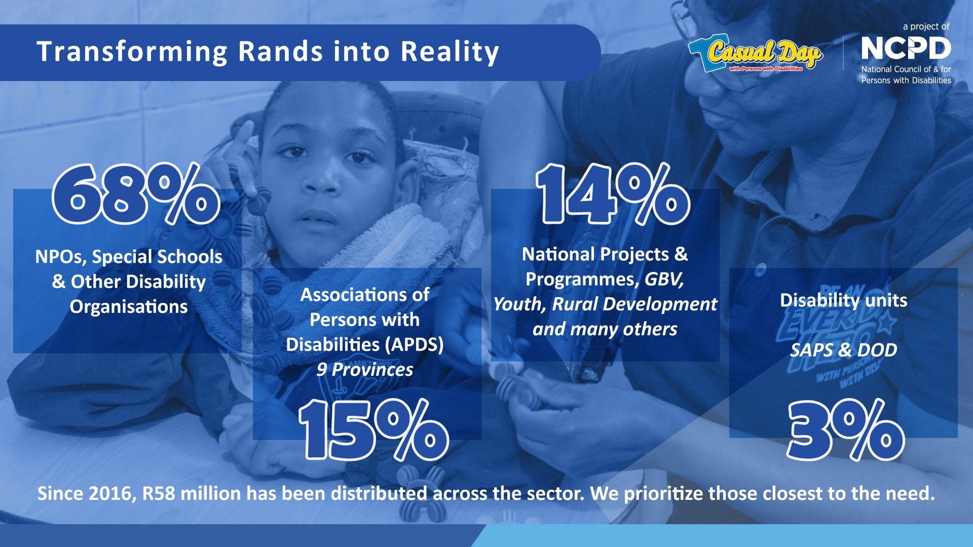 Through funds raised by Casual Day; persons with disabilities have received assistive devices, housing, skills development, the building of classrooms, transport, food gardens, Gender-Based Violence support Services, job placement, children’s programmes and Human Rights advocacy services to name a few.
