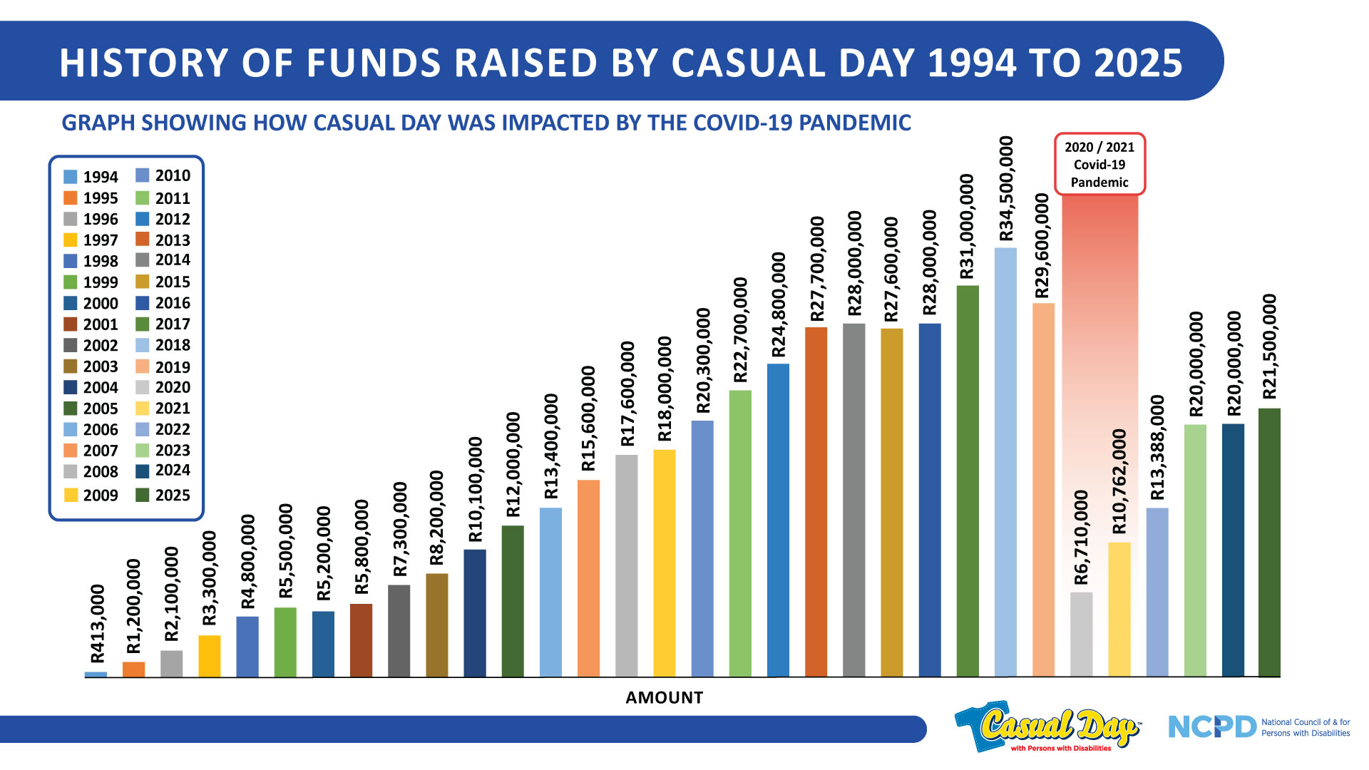 Casual Day occurs annually on the first Friday of September every year. Launched over 30 years ago, Casual Day has grown into the largest and most successful fundraising and awareness campaign for persons with disabilities, having raised and distributed half a billion since 1994. It is also an important national campaign to raise awareness about persons with disabilities through which their rights are promoted. These include access, equality, social inclusion and economic participation.